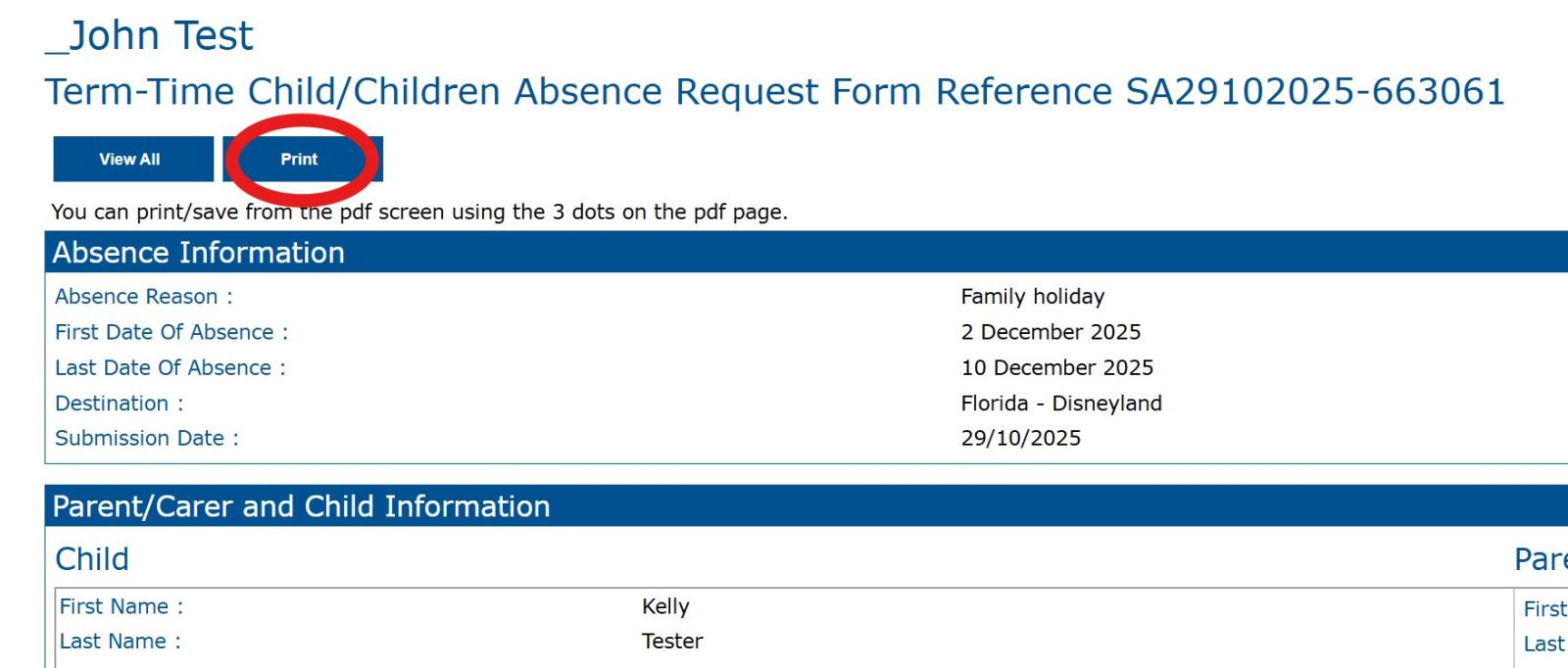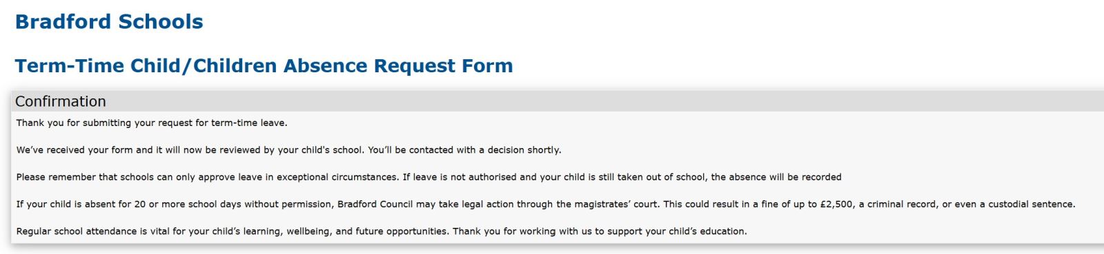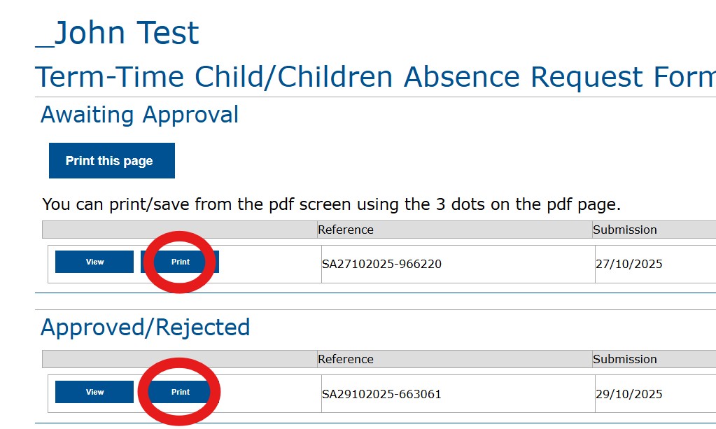 The Lead parent then gets a copy of what they have submitted entitled: “Term-Time Child/children Absence Request - see an example