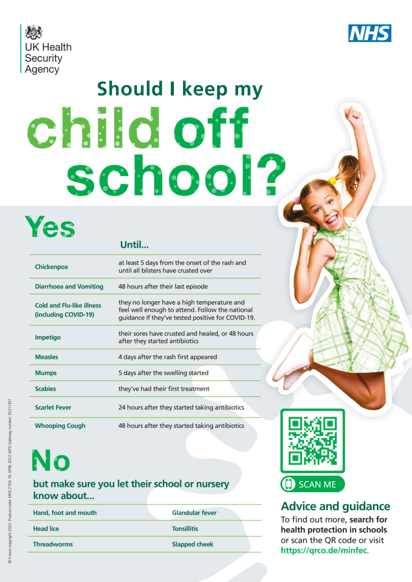 The UK Health Security Agency have produced a wealth of information, advice and guidance on this area, both in terms of ensuring child miss as little time from school as possible, but also to help minimise the risk of breakout of infectious diseases.