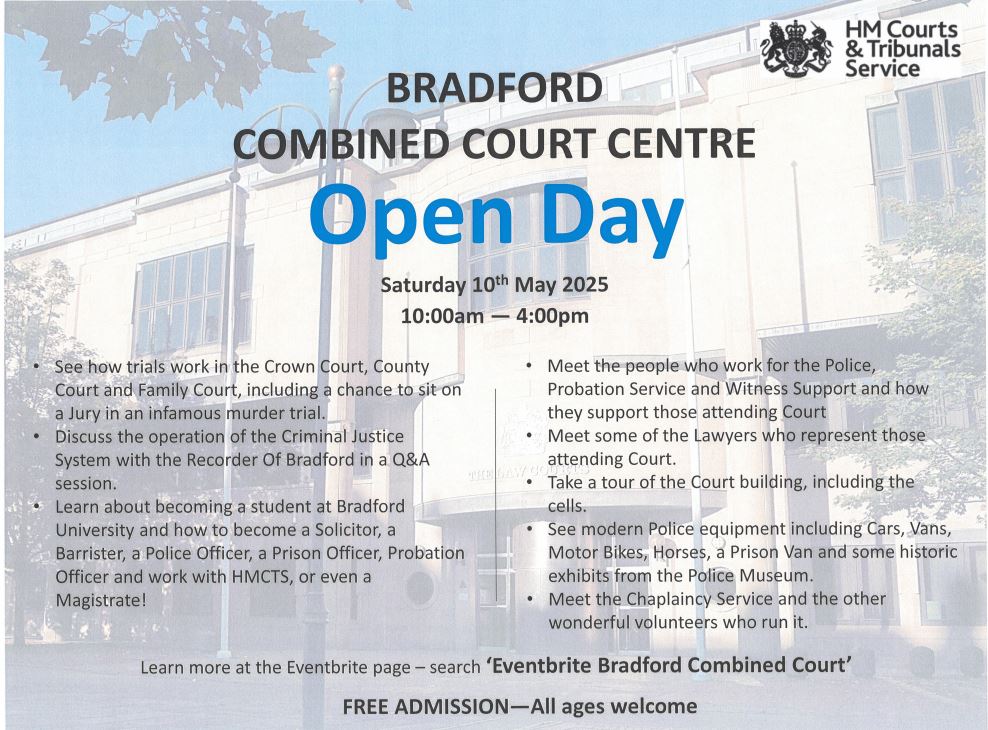 The Bradford Combined Court will be opening its doors to the public for the second time on Saturday 10th May 2025 with a packed programme of events running throughout the day. The event is worthwhile for anyone pursuing a law related career as lots of key people are there to have a chat with.