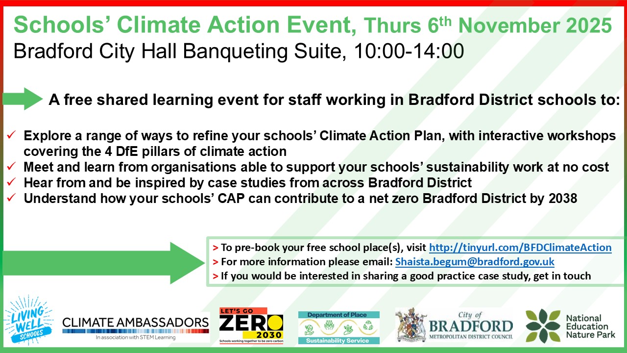 The event is free to attend and is suitable for staff from all school settings in Bradford District regardless of the current stage and status of your climate action plan. The DFE Guidance states that all schools should have a ‘named sustainability lead’