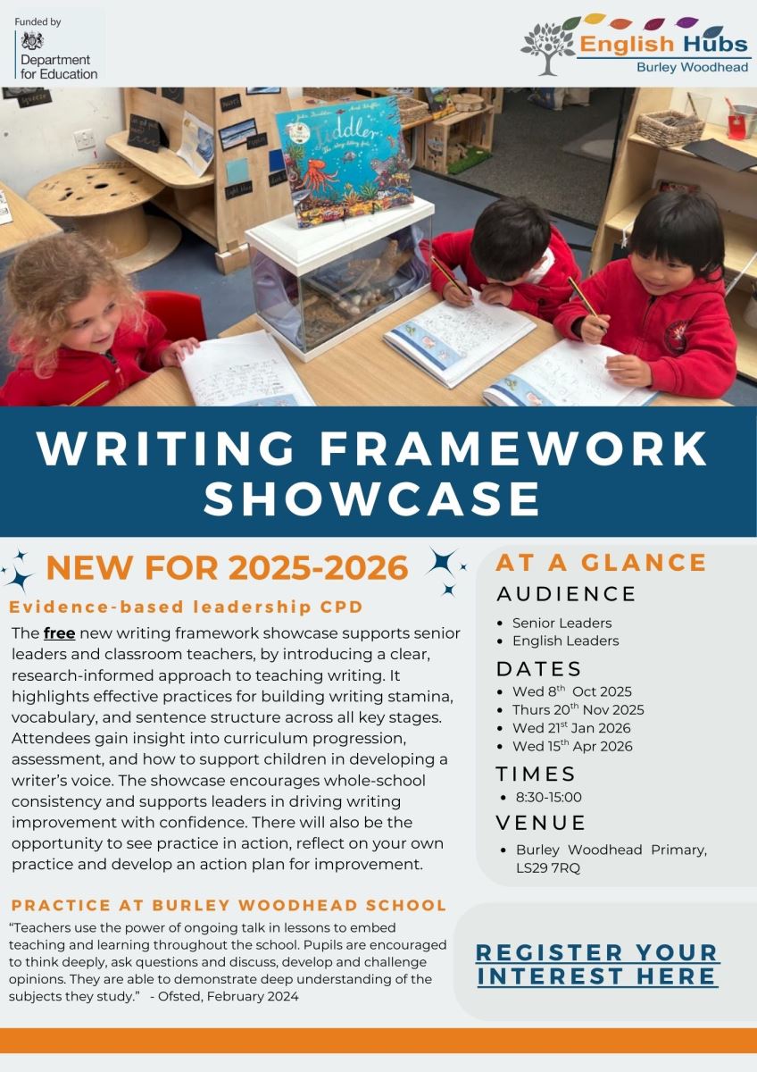 Join the free new writing framework showcase, brought to you by the English Hub, at Burley and Woodhead Primary. With dates available in October, November, January or April, this free showcase introduces a clear, research-informed approach to teaching writing.