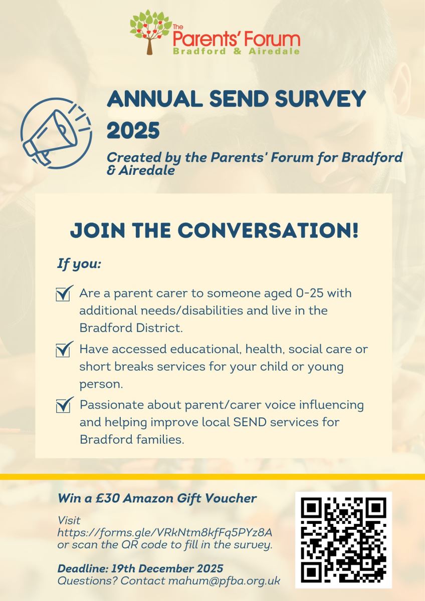 Complete this year’s SEND Parent/carer survey and help influence improvements to local SEND services: https://forms.gle/kVF4i6o9n1FuZeTq7