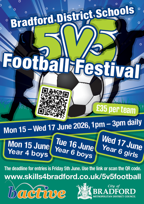 New dates for our annual event Bradford District Schools 5v5 Football Festival 2026 Mon 15th June - Year 4 Boys Tues 16th June - Year 6 Boys Wed 17th June - Year 6 Girls See attached leaflet for booking your teams.